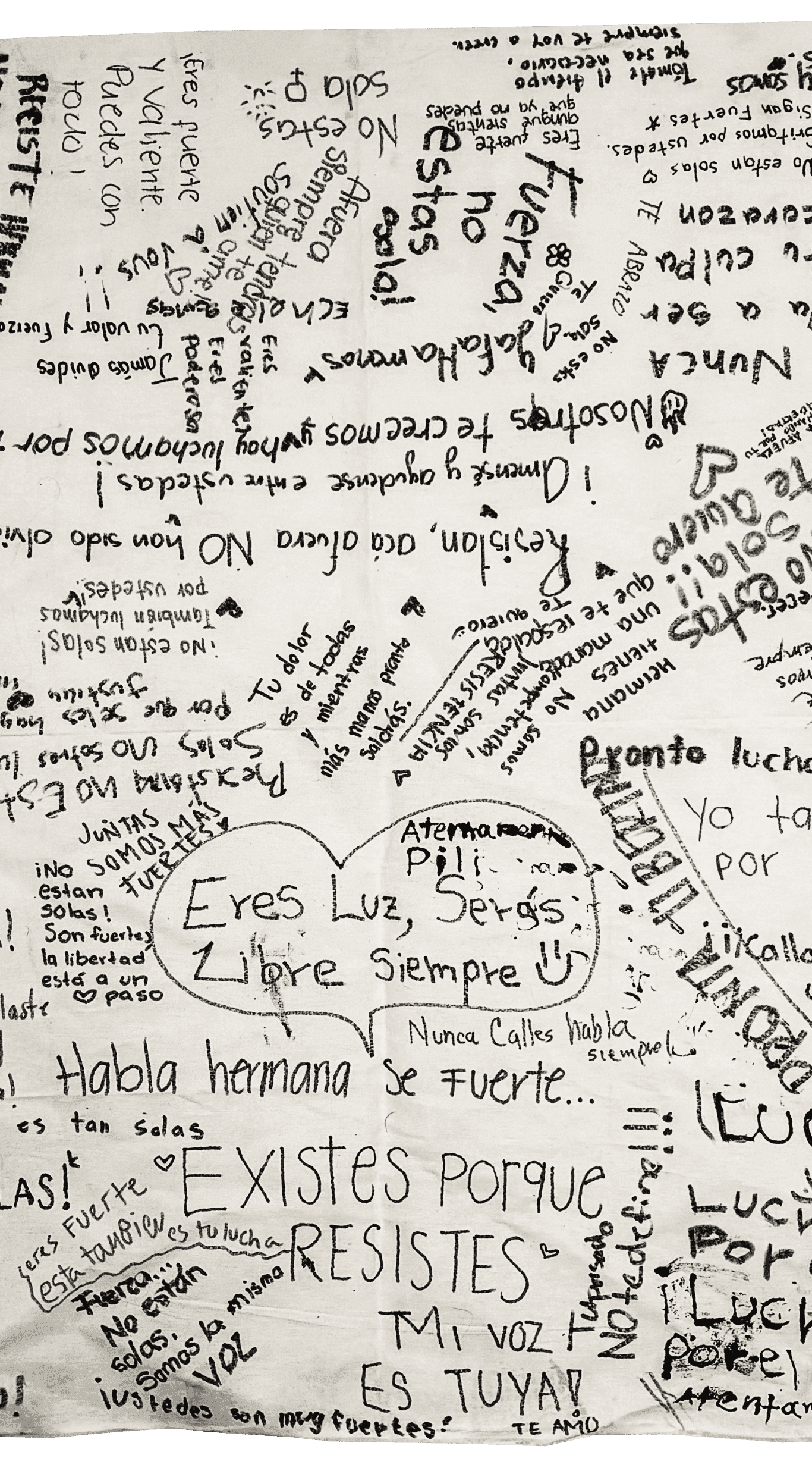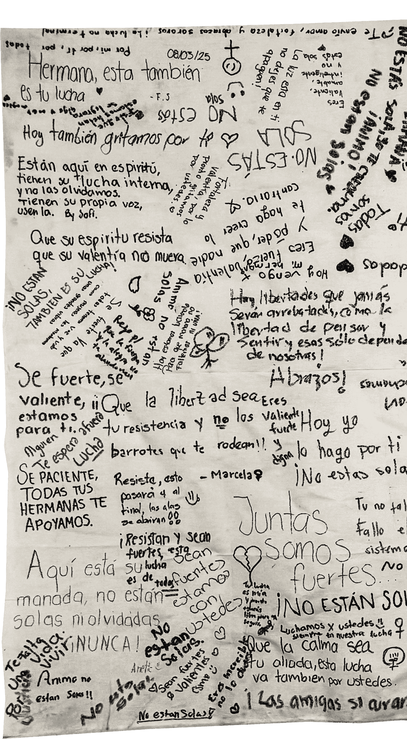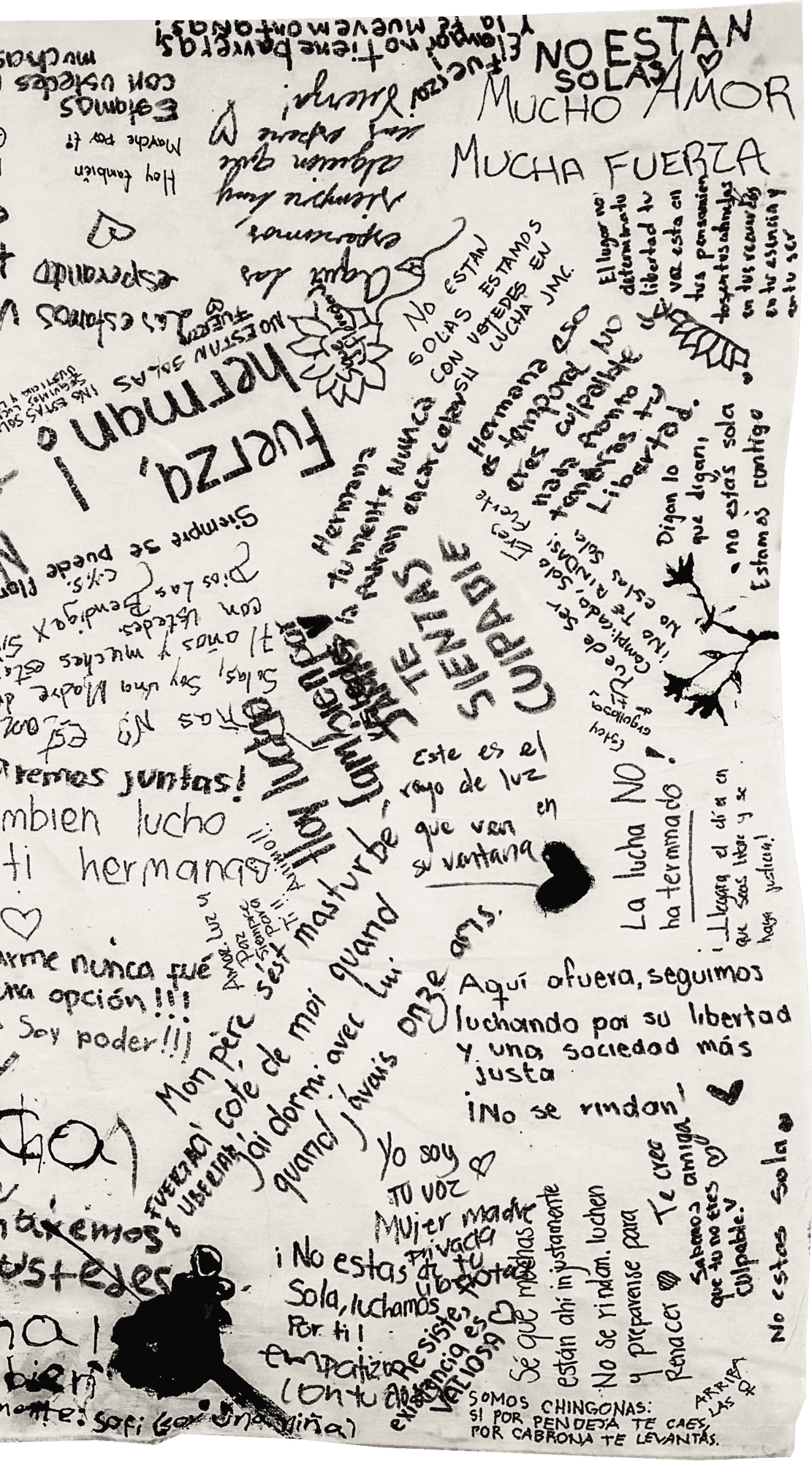 Este lienzo reúne esas voces. Son mensajes de sororidad, de compañía, de esperanza. Palabras sencillas, escritas a mano, con la intención de hacer llegar un recordatorio: no están solas.